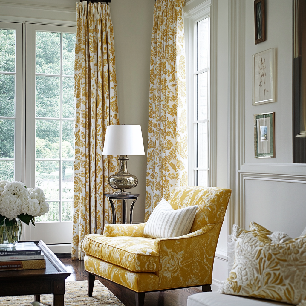 Damask Chenille Oyster accent chair + Art Deco Stripe Topez Curtains