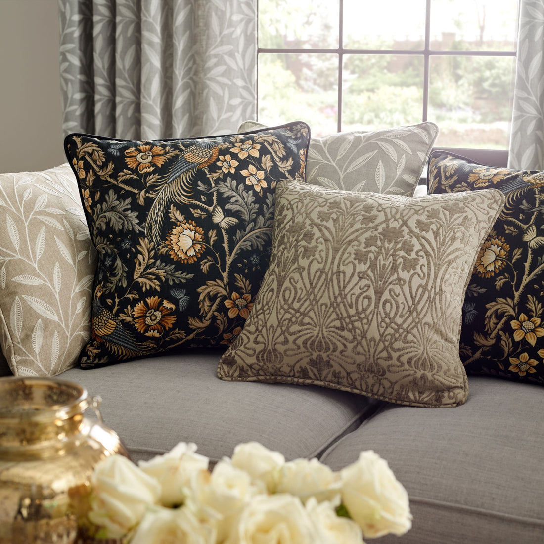 William Morris accent pillow + Evelyn Damask Reversible Platinum Fabric Curtains