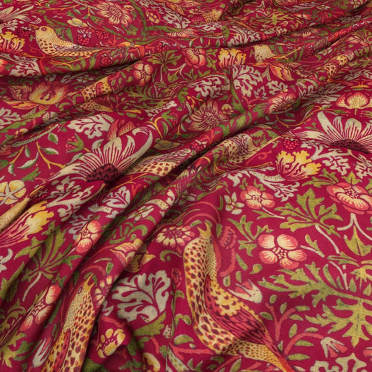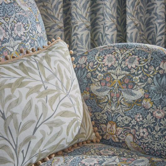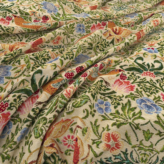 Nature-Inspired Motifs: Morris was deeply inspired by nature, and this is reflected in his fabric designs. Common motifs include stylized flowers, vines, leaves, birds, and fruits. Patterns like Strawberry Thief, Willow Boughs, and Golden Lily, are iconic examples, with intricate depictions of natural forms rendered in an artistic, organic style.