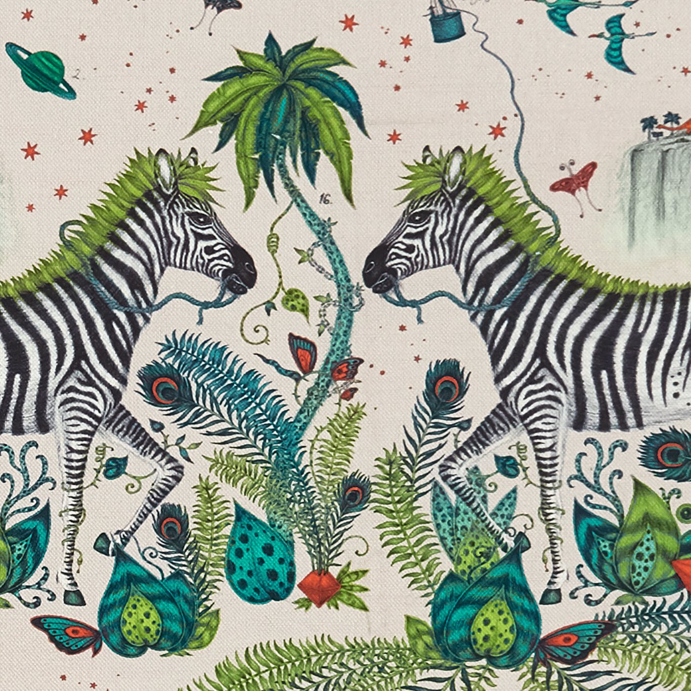 This intricate pattern invites you to embark on a journey of exploration and imagination. The textured, neutral linen serves as a versatile foundation for the vibrant green, teal, zebra print, and burnt orange accents to truly come to life.