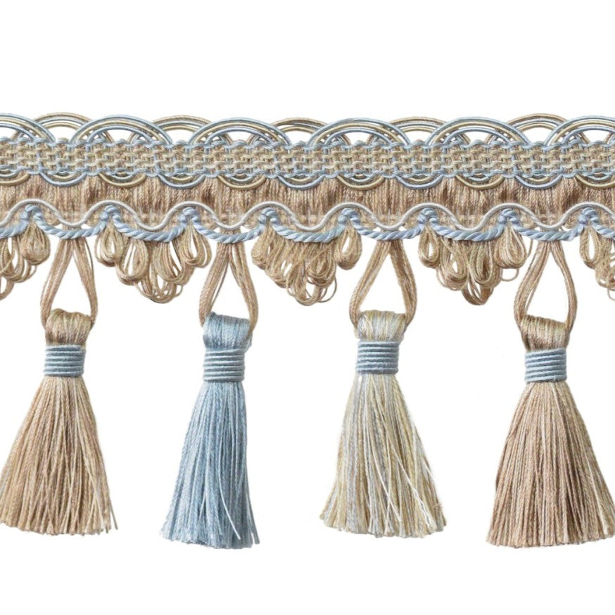 The Verona Scalloped Tassel Fringe is a statement trim designed to bring a touch of opulence and sophistication to your home décor. Featuring an intricately scalloped header adorned with elegant tassels and delicate gimp detailing, this exquisite fringe adds movement, texture, and luxury to soft furnishings, drapery, and upholstery.