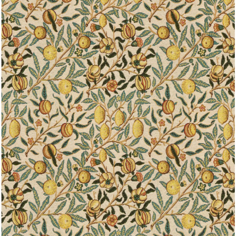 Fruit is one of William Morris's best known designs. This intricately woven jacquard features citrus fruits and pomegranates in a rich colour scheme, reminiscent of Mediterranean orchards juxtaposed with English Tudor roses.
